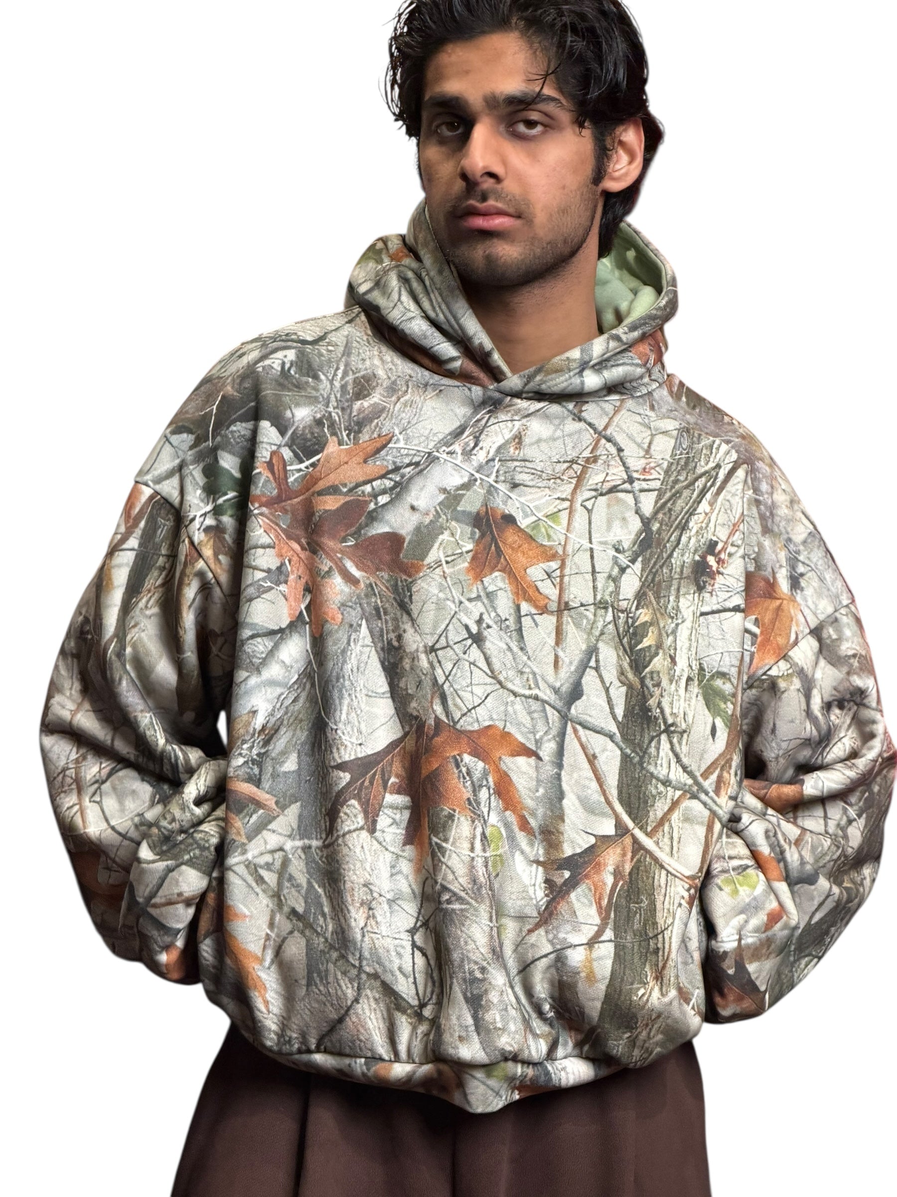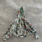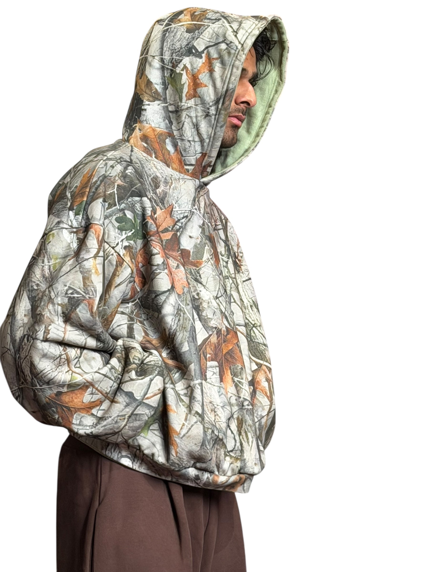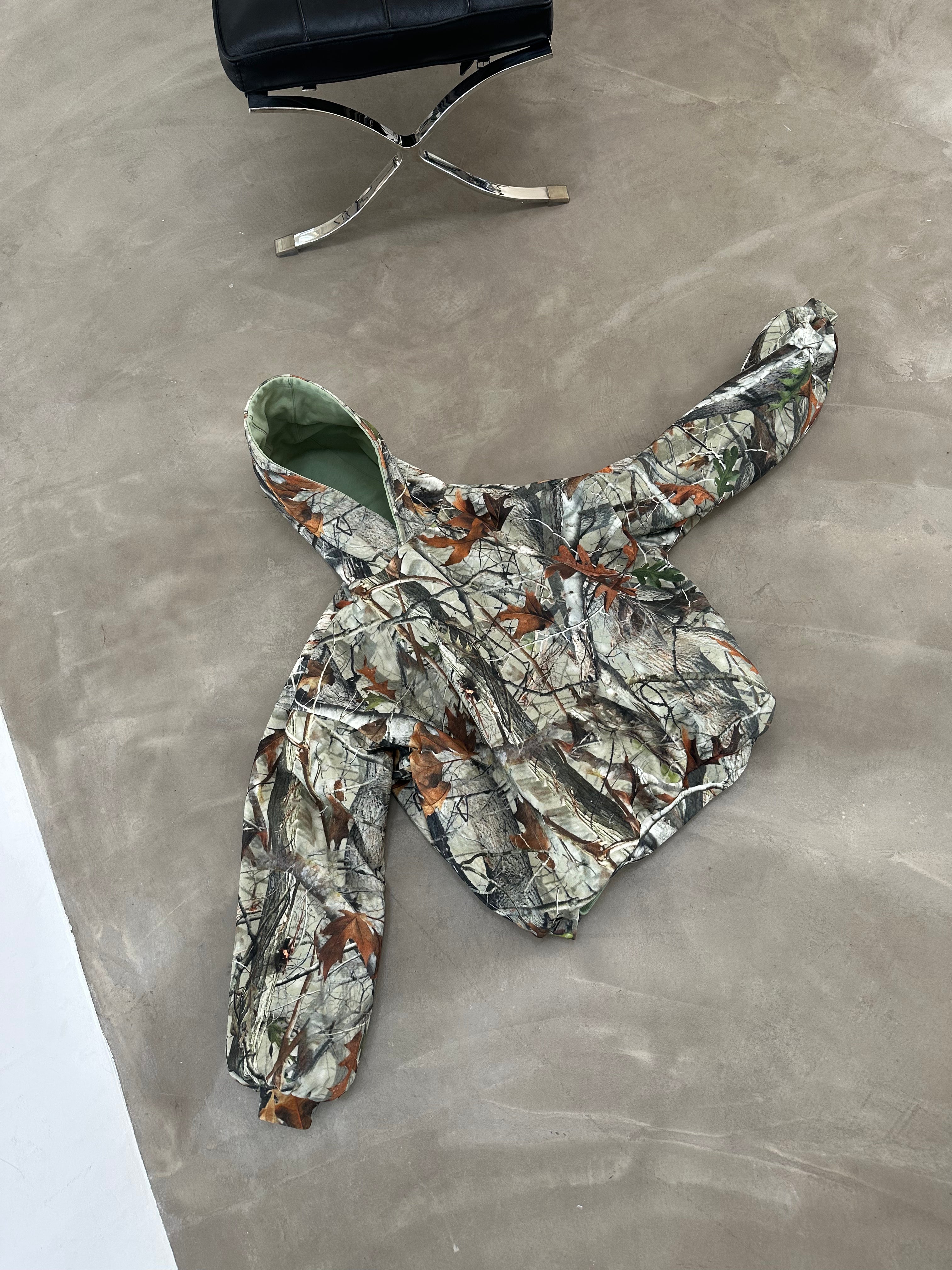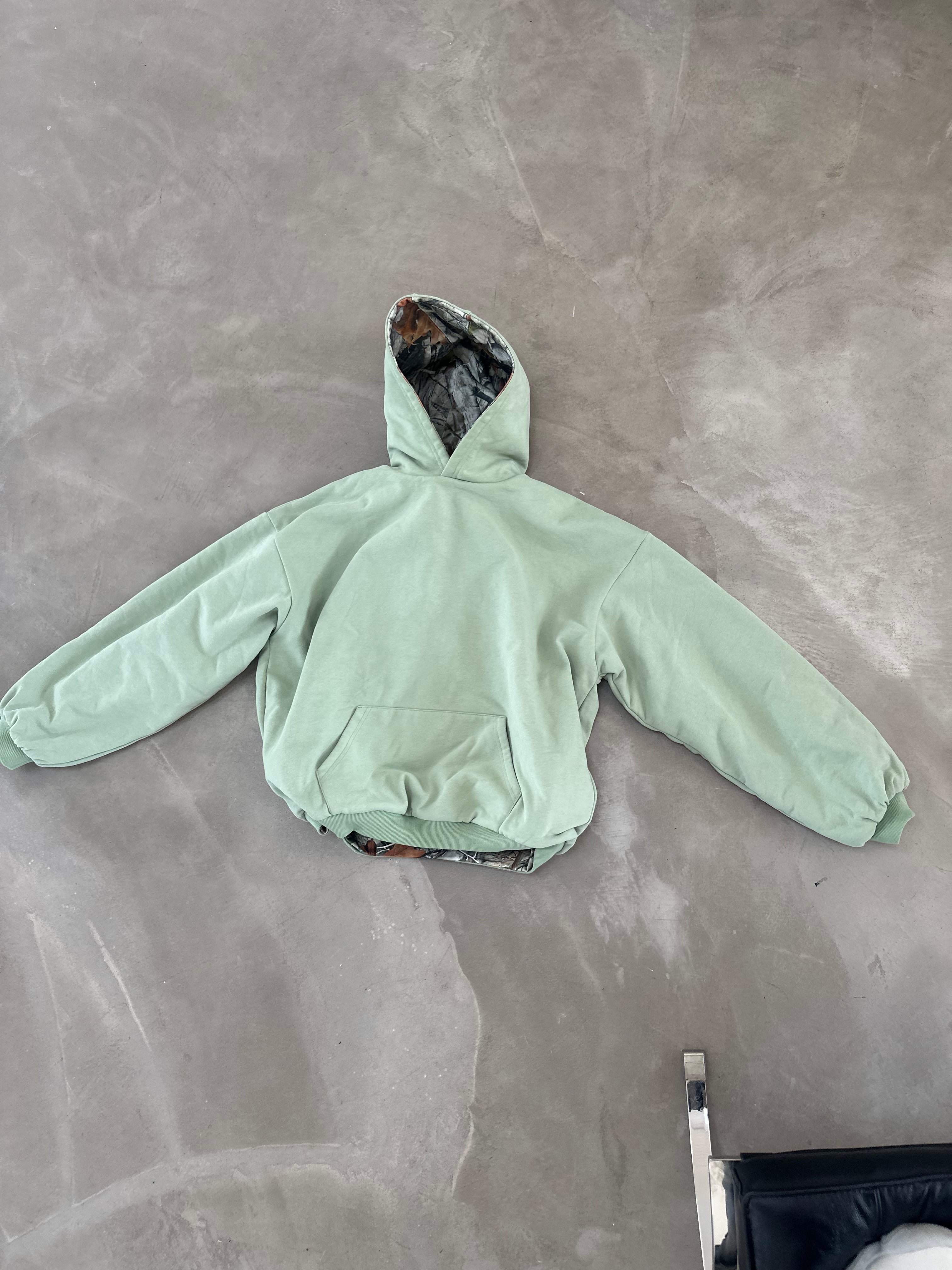 Reversible - One side is a light misty green, whilst the other is a woodland pattern