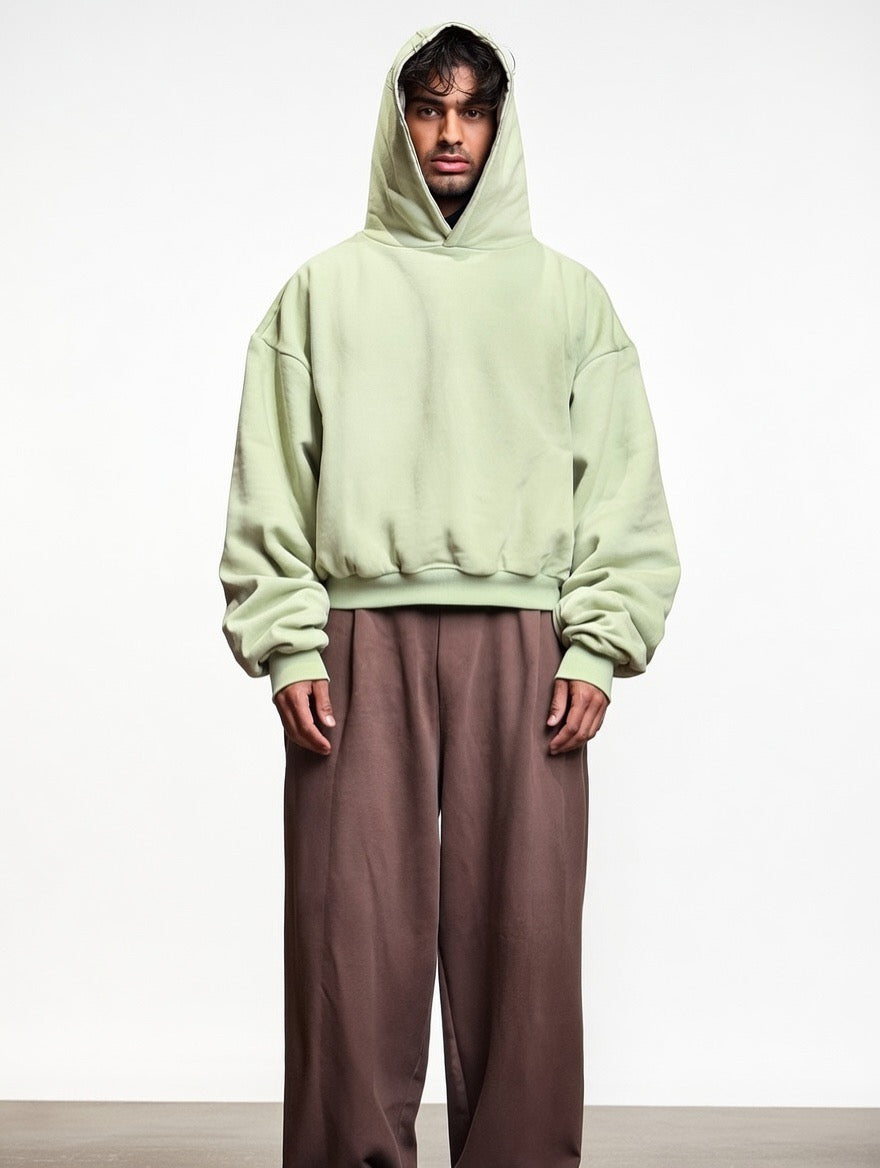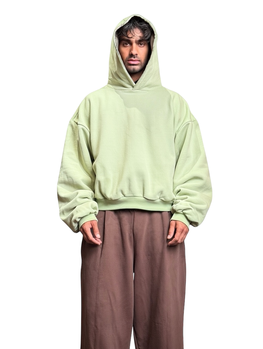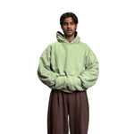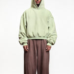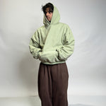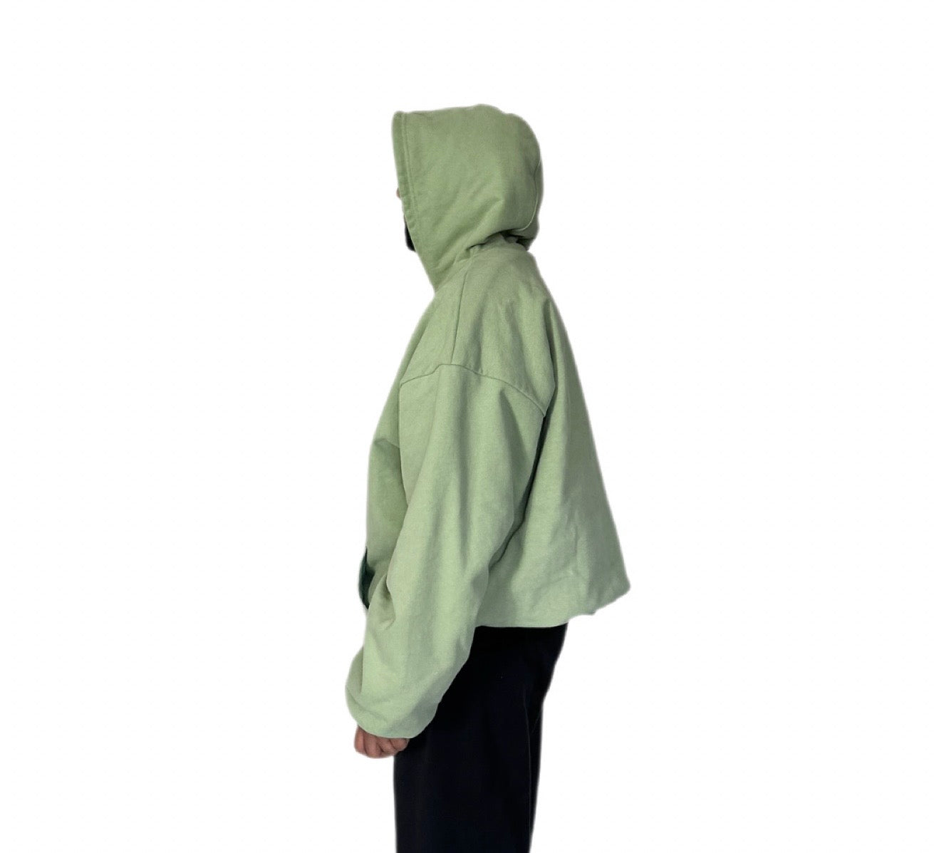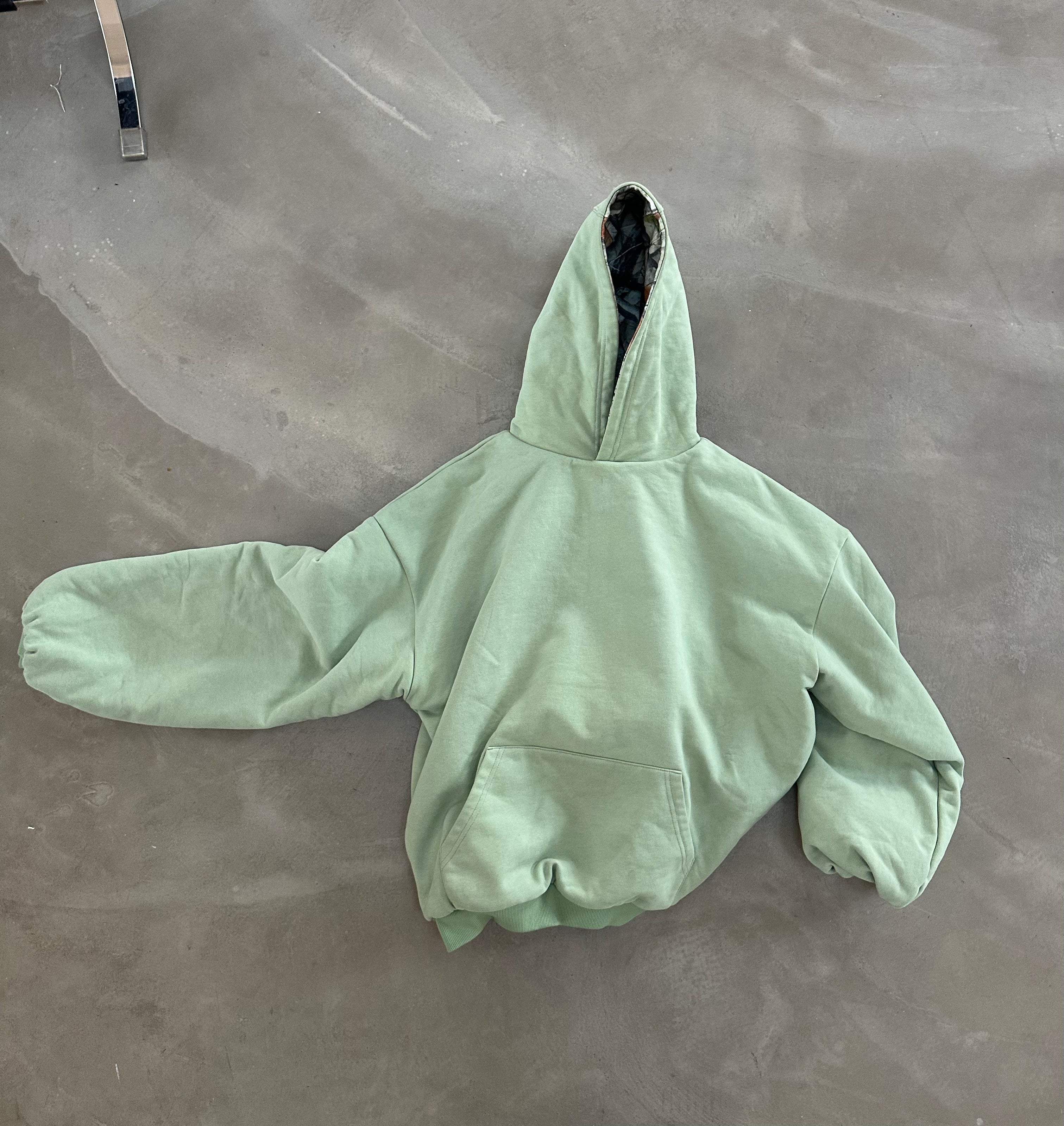 The second version of our 1000GSM double layered hoodie and the first time we have developed it as a reversible hoodie. Back in 2022 we created our first version, and in 2025 we have revisted it. We decided to make the hoodie a lot more bulky, both the body and the arms are a lot wider. As the hoodie is 100% cotton, it does not have the puffy feel that our polyester/cotton blends have. However the garment is a perfect oversized baggy hoodie with the additional benefit of it being reversible.